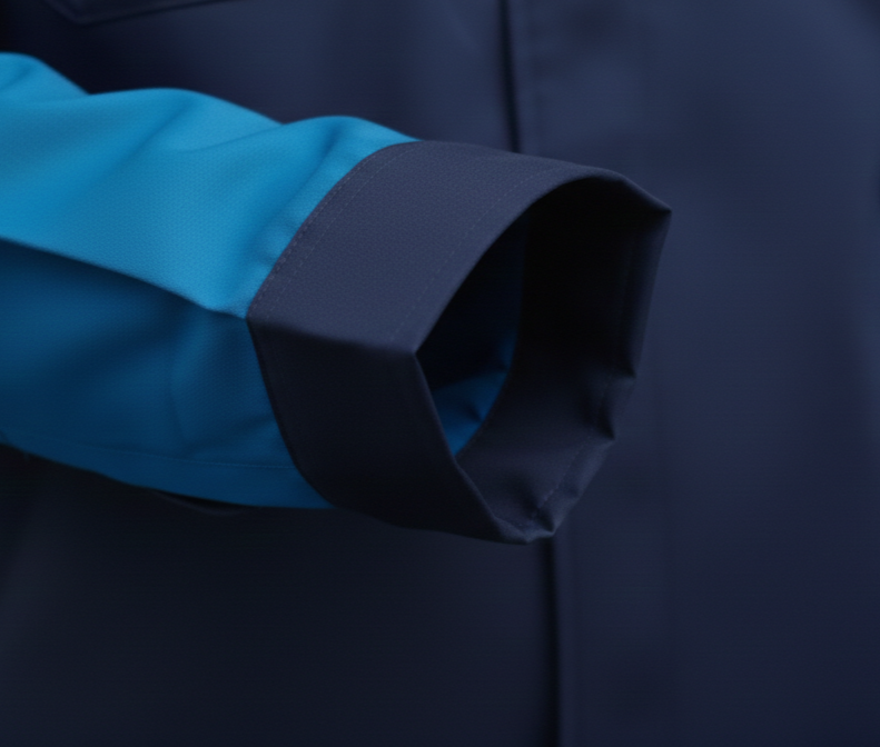 • Cuffs: Contrasting navy blue barrel cuffs (likely with button or snap closures) to match the lower body.